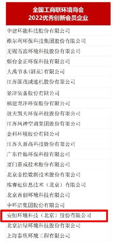 今年9月,环境商会启动“2022年度*秀创新会员企业”征集工作。经过严格的申报、审核流程,安恒环境科技(北京)股份有限公司获得“2022年度*秀创新会员企业”荣誉。未来,根据国家、省、市**单的不断增补,形成环境商会年度*秀创新企业榜单。具体*单如下:
